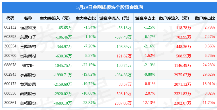 从资金流向上来看,当日金刚线板块主力资金净流出1.4亿元,游资资金净流入1356.51万元,散户资金净流入1.26亿元。金刚线板块个股资金流向见下表: