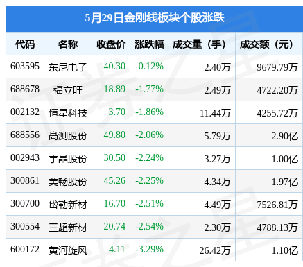 5月29日金刚线板块较上一交易日下跌1.98%,黄河旋风领跌。当日上证指数报收于3221.45,上涨0.28%。深证成指报收于10822.09,下跌0.8%。金刚线板块个股涨跌见下表: