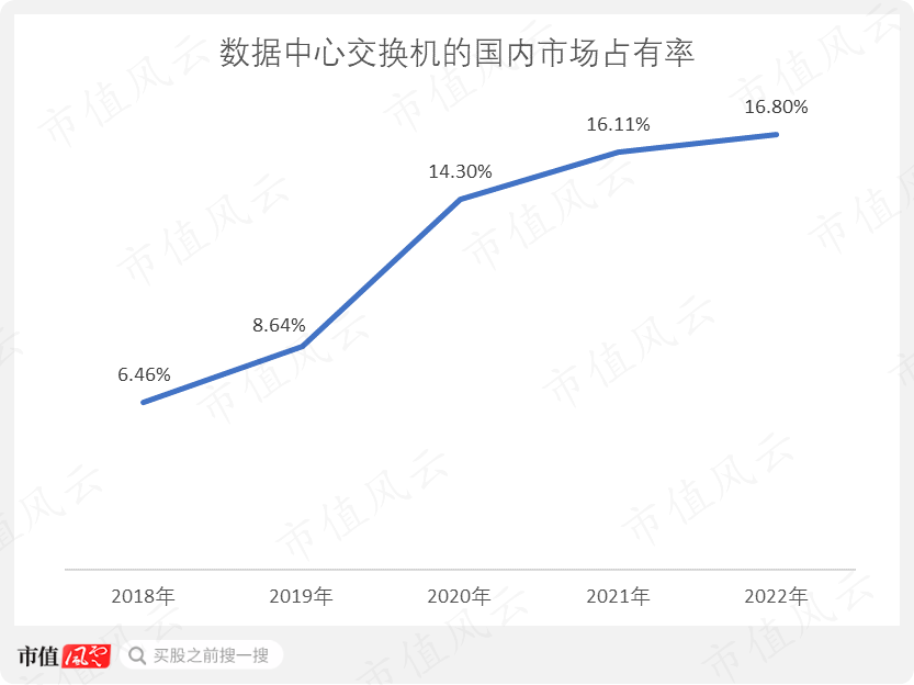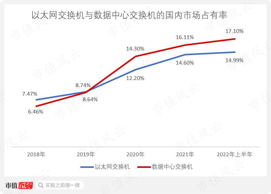 比如以太网交换机的国内市场占有率就从2018年的7.47%一路提升至2022年上半年的14.99%,同期数据中心交换机的国内市场占有率则从6.46%提升至17.1%。
