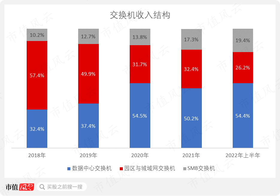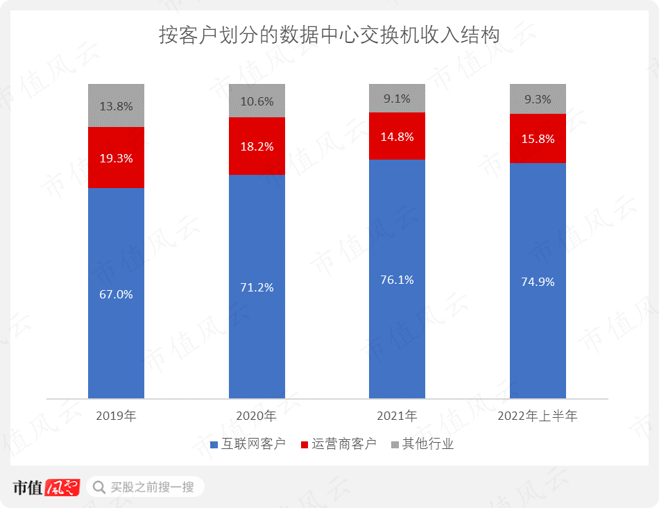 2019-2022年上半年,数据中心交换机收入的70%都是来自互联网企业客户,还有20%来自运营商客户。