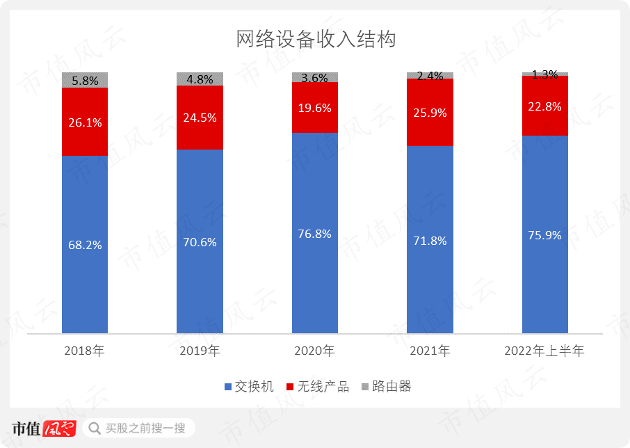 网络设备进一步分为交换机、无线产品以及路由器。2018-2022年上半年,交换机占网络设备收入的比例保持在70%左右,占营收的比例一直在50%以上,是公司的绝对核心产品。