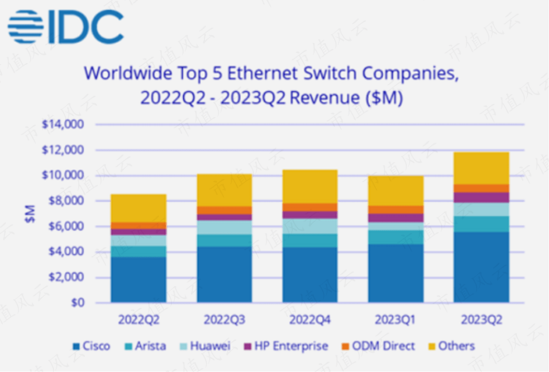 根据IDC的统计,2023年第一季度中国以太网交换机市场收入同比下滑了5%。2023年第二季度,中国以太网交换机市场收入同比再次下滑7.8%。