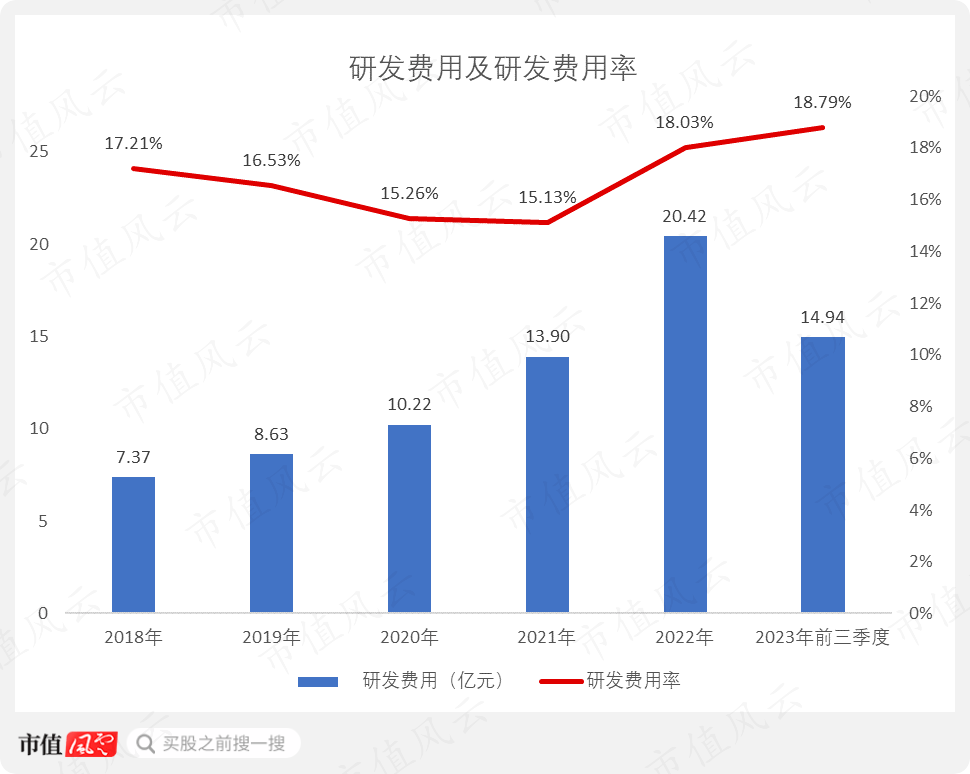 研发费用从2018年的7.37亿元逐年递增至2022年的20.42亿元。研发费用率长期维持在17%上下。截至2023年上半年末,公司拥有近1300项发明专利,研发人员占员工总数的比例接近60%。