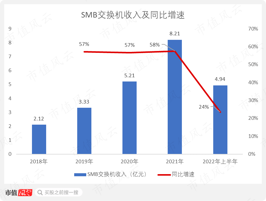 SMB交换机收入从2018年的2.12亿元增长至2021年的8.21亿元,期间CAGR高达57%。2022年上半年,SMB交换机收入同比增长了24%。