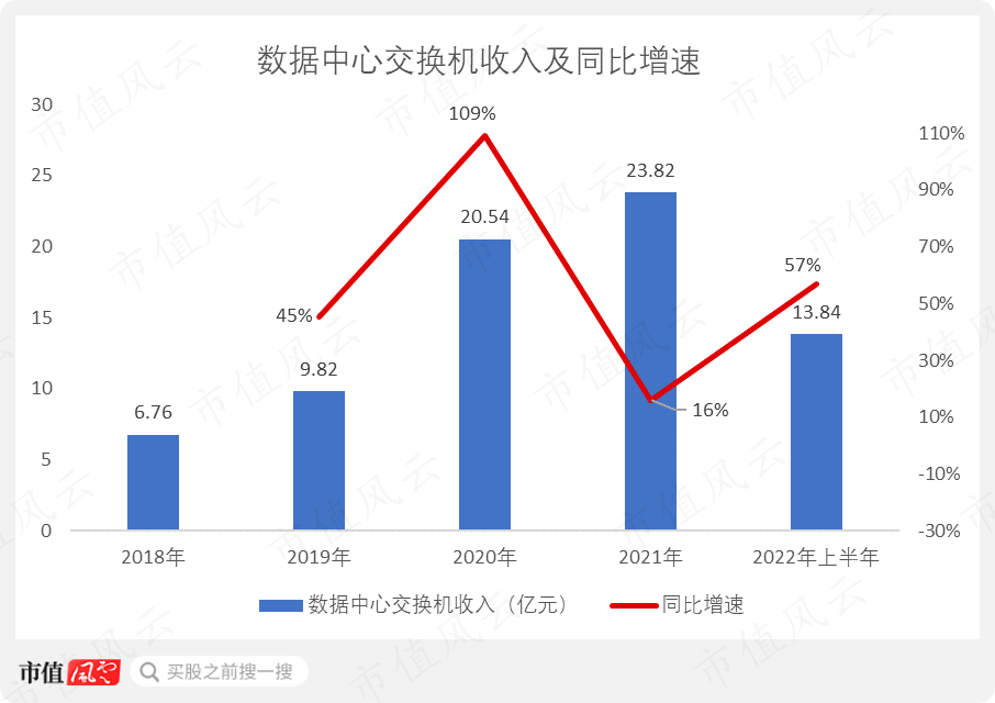 2018-2021年,数据中心交换机收入从6.76亿元增长至23.82亿元,期间CAGR高达52%。2022年上半年,数据中心交换机收入同比增长57%。