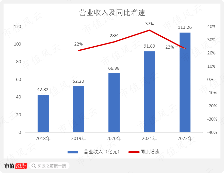 公司营收于2022年首次突破100亿元大关,达到113.26亿元。营收从2018年的42.82亿元增长至2022年的113.26亿元,期间CAGR达到28%。
