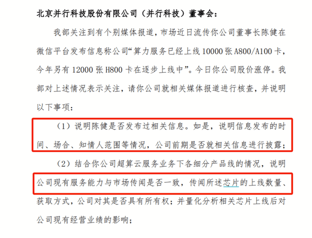 根据《问询函》显示的信息来看,近日有一则署名为并行科技董事长“陈健”的微信群聊信息在市场上流传,信息的内容大概为:“大家好,并行科技陈健报到,我们算力服务已经上线10000张A800/A100卡,今年另有12000张H800卡在逐步上线中,超算模式算力,价格极具竞争力,欢迎试用。”