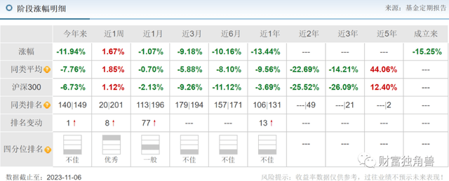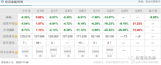 据天天基金网显示,中银慧泽积极3个月持有混合发起(FOF)A成立于2022年6月29日,基金经理为邢秋羽和姚卫巍共同管理,任职251天,任职回报-13.86%。截至3季度末基金规模仅剩0.18亿元。截至11月6日基金单位净值0.8475,自基金成立来收益率-15.25%,今年来收益率-11.94%,近6月来收益率-10.16%,近1年来收益率-13.44%。从业绩上看,该基金业绩并不理想。