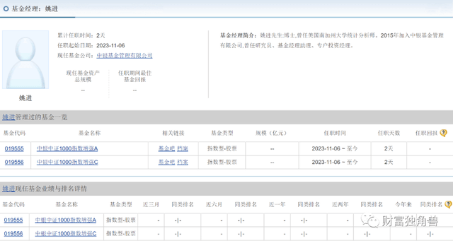即将发行的中银中证1000指数增强A/C基金,拟由赵志华和姚进共同管理,但从姚进的就职履历上看,姚进一只从事行业研究工作,并没有单独管理基金的经验。据天天基金网显示,姚进曾任美国南加州大学统计分析师。2015年加入中银基金管理有限公司,曾任研究员、基金经理助理、专户投资经理。