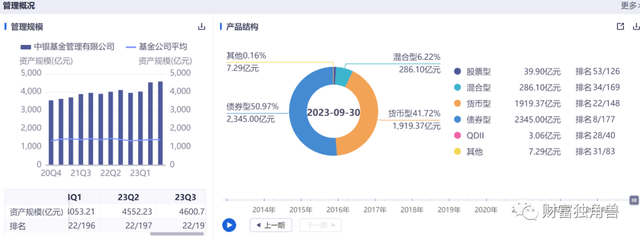 在公募行业中,基金管理的业绩是基金公司最为直观的表现形式,而主动投资能力历来被视为基金公司的核心竞争力。如果一家基金公司旗下产品业绩优异,基民会追着买相关产品。但从中银基金的产品结构上看,债券型基金规模2345亿元,占比50.97%;货币型基金规模1919.37亿元,占比41.72%;混合型基金规模286.10亿元,占比6.22%。