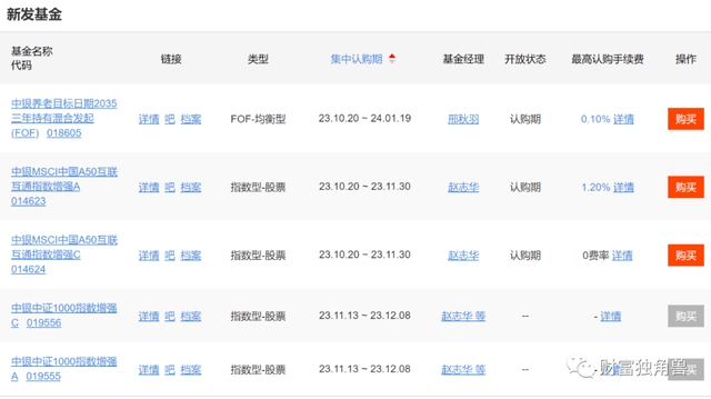 笔者还发下,中银基金正在发行另外2只基金都是拟由赵志华管理,中银MSCI中国A50互联互通指数增强A/C集中认购期2023年10月20日-2023年11月30日由赵志华单独管理,该基金属于指数型-股票产。另一只基金中银中证1000指数增强A/C基金,该基金拟由赵志华和姚进共同管理,集中认购期2023年11月13日-2023年12月8日,该基金属也属于指数型-股票基金。