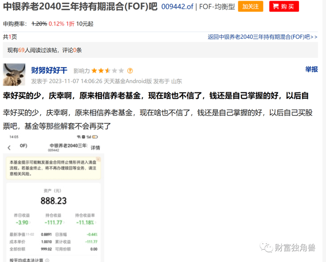 基金业绩亏损,有基民表示,幸好买的少,庆幸啊,原来相信养老基金,现在啥也不信了,钱还是自己掌握的好,以后自己买股票吧,基金等那些解套不会再买了。有基民也表示,马上就清盘,所谓养老目标基金就是韭菜众筹帮基金公司来养老。