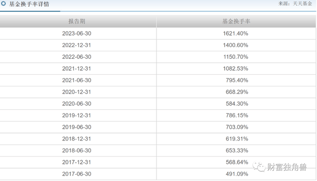 笔者还发现,中银量化精选混合A的换手率极高,从各季度的换手率看,最低的换手率在2017年2季度出现491.09%,最高换手率于2023年2季度出现以此,换手率高达1621.40%。自2021年4季度开始,已经连续出现4次高达1000%以上的换手率,不过,即便是高换手率仍然没有换来高收益,近年来业绩并不理想。