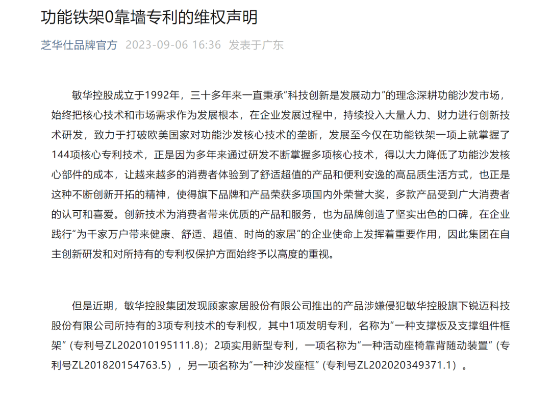 今年9月6日芝华仕在公众号发文,直指顾家家居沙发展品涉嫌侵犯敏华控股旗下子公司持有的3项专利技术的专利权,并表示已向法院提起诉讼,要求顾家家居立即停止侵权行为。