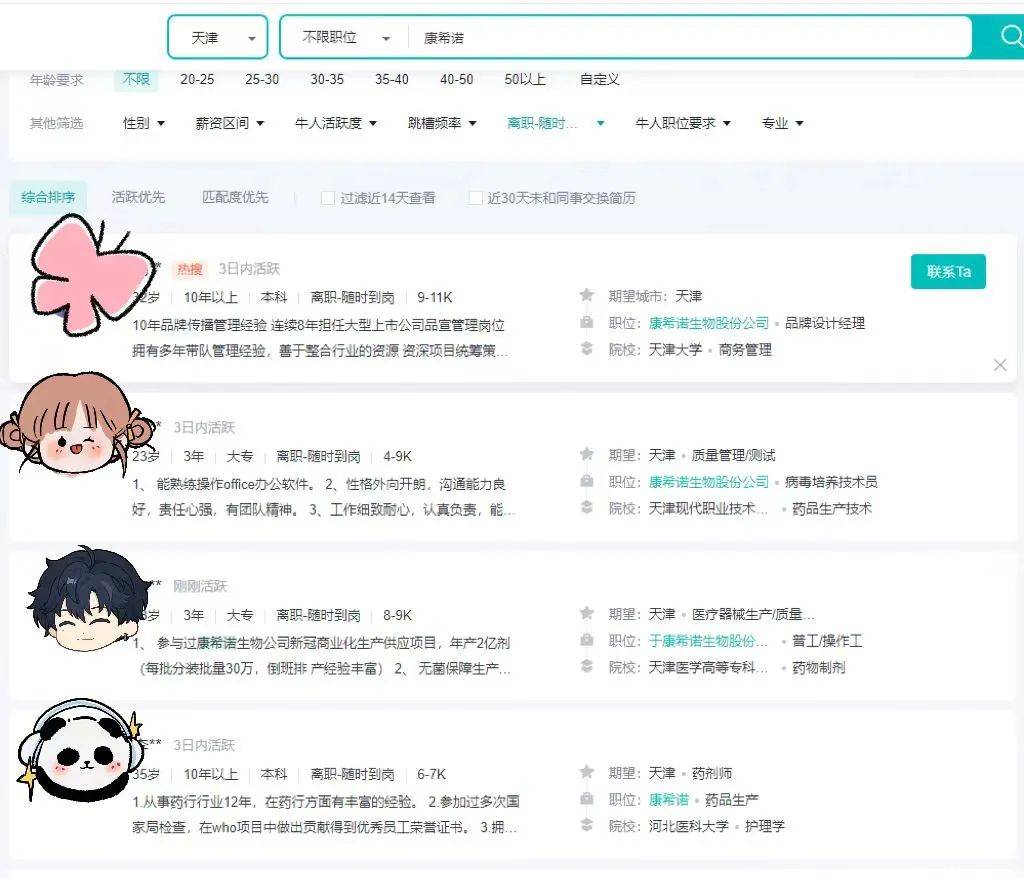 而近日,在BOSS直聘等招聘软件上,也可以发现天津出现众多有康希诺从业经历的离职人员在找工作。