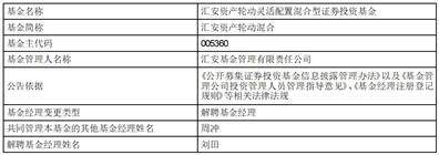 原标题:汇安资产轮动灵活配置混合型证券投资基金基金经理变更公告