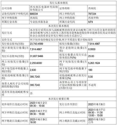 1、西高院首次公开发行人民币普通股(A股)(以下简称“本次发行”)的申请已经上交所科创板股票上市委员会审议通过,并已经中国证券监督管理委员会同意注册(证监许可〔2023〕726号)。本次发行的保荐人(主承销商)为中金公司。发行人股票简称为“西高院”,扩位简称为“西高院”,股票代码为“688334”,该代码同时适用于本次发行的初步询价及网下申购。本次发行网上申购代码为“787334”。按照《国民经济行业分类》(GB/T4754-2017),公司所处行业为“专业技术服务业(M74)”。