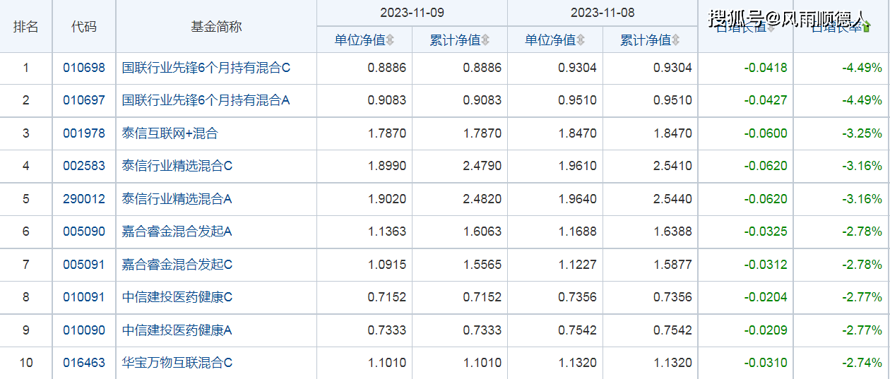 9日开放式基金净值增长排名后10的基金分别是:国联行业先锋6个月持有混合C、国联行业先锋6个月持有混合A、泰信互联网+混合、泰信行业精选混合C、泰信行业精选混合A、嘉合睿金混合发起A、嘉合睿金混合发起C、中信建投医药健康C、中信建投医药健康A、华宝万物互联混合C。