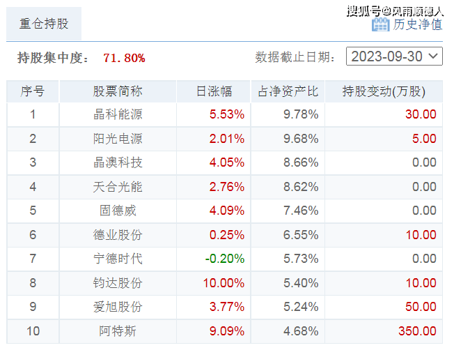该基金十大持仓中钧达股份涨停,晶科能源、晶澳科技、固德威、爱旭股份、阿特斯涨幅较大, 前十大持仓占总持仓71.80%,基金的持仓风格偏向光伏行业,基金净值相对跑赢市场(属于新能源行业光伏细分领域的主动型混合基金) 【基金规模4.20亿元】。净值增长较差的是国联行业先锋6个月持有混合C,