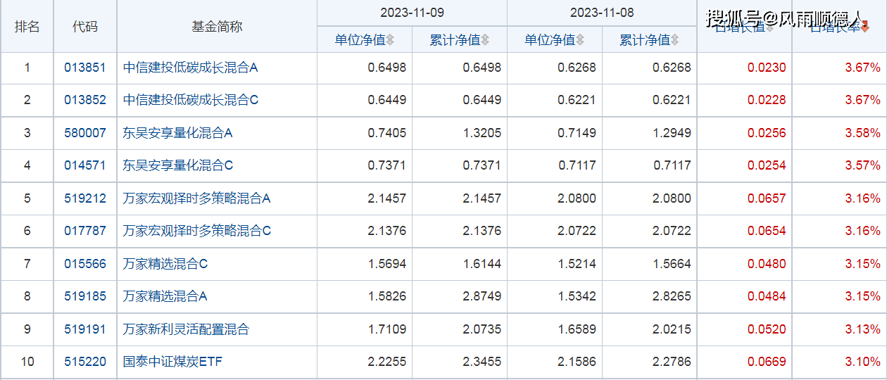 9日开放式基金净值增长排名前10的基金分别是:中信建投低碳成长混合A、中信建投低碳成长混合C、东吴安享量化混合A、东吴安享量化混合C、万家宏观择时多策略混合A、万家宏观择时多策略混合C、万家精选混合C、万家精选混合A、万家新利灵活配置混合、国泰中证煤炭ETF。