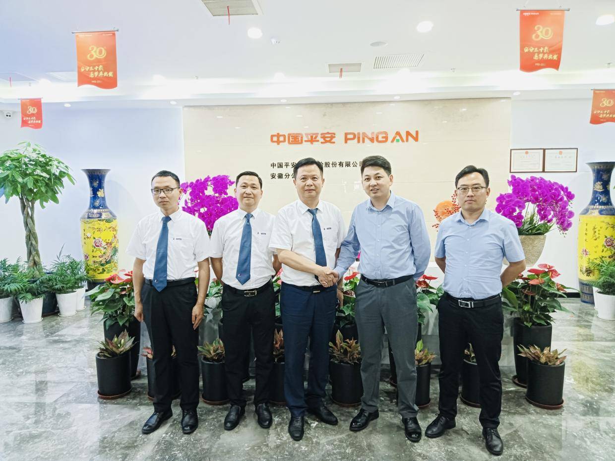 5月29日,人民控股集团董事长助理张世林、市场部总监曹原、品牌保险部总监李耀武一行走访平安财产保险安徽分公司,受到了中国平安财产保险股份有限公司安徽分公司财意险部经理何康、销售总监孙树波的热情接待。