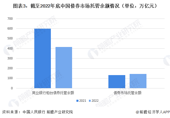 从托管余额情况来看,截至2022年12月末,债券市场托管余额144.8万亿元,同比增长11.3万亿元,其中银行间债券市场托管余额125.3万亿元,交易所市场托管余额19.5万亿元。商业银行柜台债券托管余额416.1亿元。