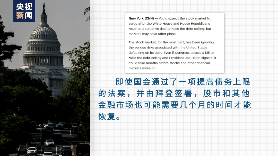 此外,即便两党就债务上限达成初步一致,未来股市走向仍不容乐观。美国有线电视新闻网29日发表文章,题为《别指望股市会为债务上限协议感到高兴》。文章写道,“即使国会通过了一项提高债务上限的法案,并由拜登签署,股市和其他金融市场也可能需要几个月的时间才能恢复。”