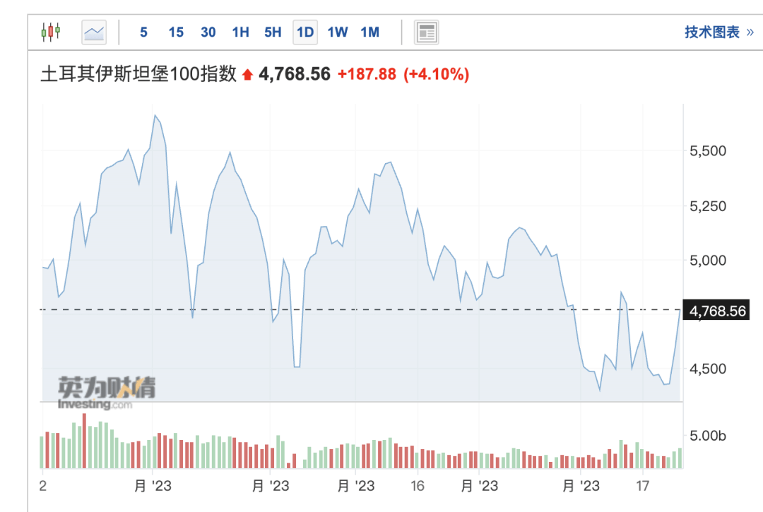 新兴市场中,土耳其总统埃尔多安成功连任,土耳其股指、伊斯坦布尔证交所全国100指数周一收涨4.1%,连涨两日,逼近5月12日收盘位。