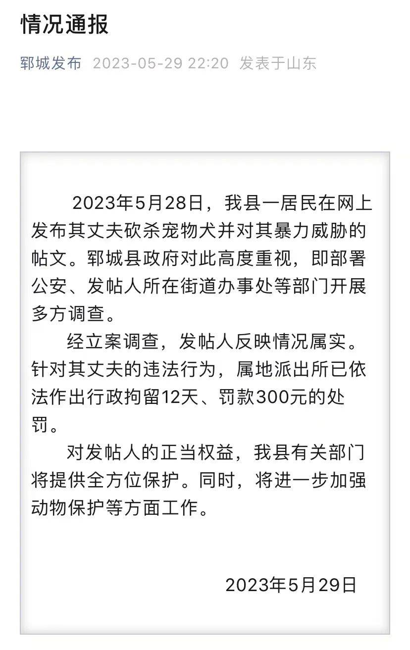 5月29日晚,山东省菏泽市郓城县政府通报“男子砍杀柯基并威胁妻子”事件。全文如下:
