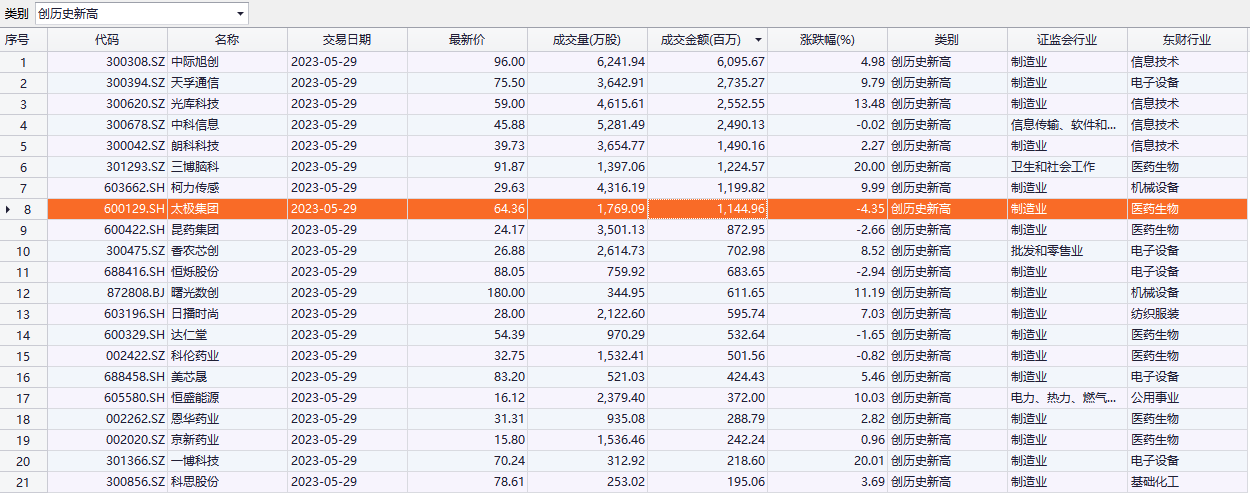 上证报中国证券网讯 Choice数据统计,5月29日共有21只个股股价创历史新高,集中在医药生物、信息技术行业,包括中际旭创、天孚通信、中科信息、三博脑科、柯力传感、太极集团等。