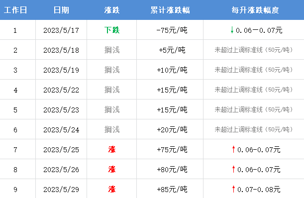 5月29日,本轮国内油价计价统计周期第9个工作日,当前参考原油变化率为1.79%,预计汽柴油累计上调85元/吨,折算为每升油价上涨0.07-0.08元,加满50升将多花3.5元左右。