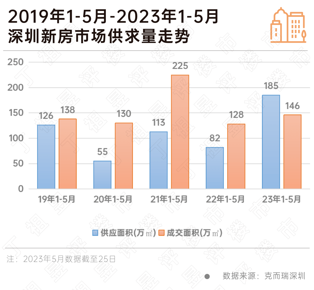 于此同时,新房供应达近5年最高,虽然成交处于近5年第二位,高于19年,但最主要的区别是过去4年1-5月供不应求,今年1-5月供过于求。