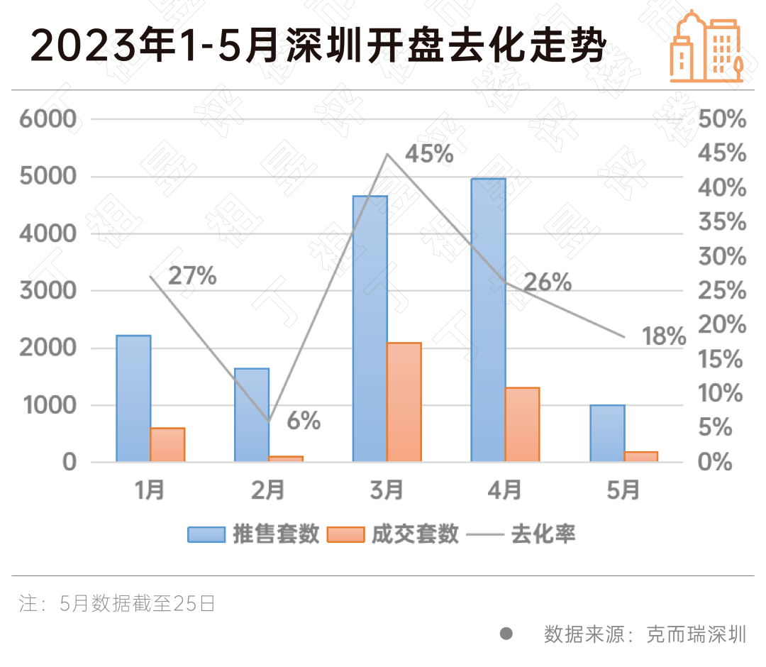 从此次禁止“负首付”的深圳来看,整体市场,跟全国趋势一致呈“落-起-落”的态势,2023年5月,深圳市场开盘以刚需项目为主,整体去化率回落至18%。