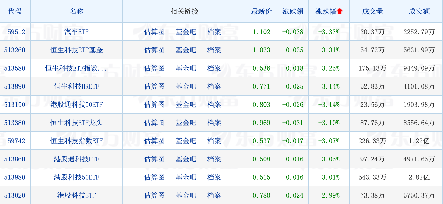 下跌方面,港股恒生科技指数回调超3%,恒生科技相关ETF集体受累领跌,最高下跌3.31%。