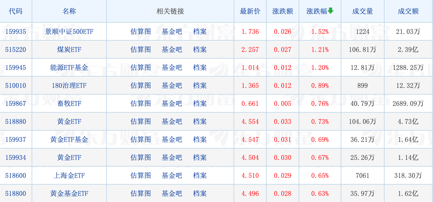具体来看,煤炭、电力股尾盘异动,云煤能源涨停,带动煤炭相关ETF领涨,最高涨1.21%。此外,多只黄金ETF进入涨幅榜前列。