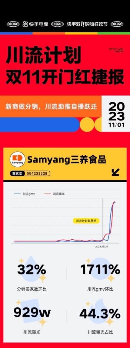 一年一度的快手双11购物狂欢节即将接近尾声,不少品牌商家都成功借势大促节点,实现强势增长。比如,首次在快手开启品牌自播的“Samyang三养食品“在快手双11大促期间增长迅猛,在10月23日-10月31日期间,三养食品获得了近千万川流计划曝光,来自川流计划曝光的占比超过40%,川流GMV环比提升超17倍。