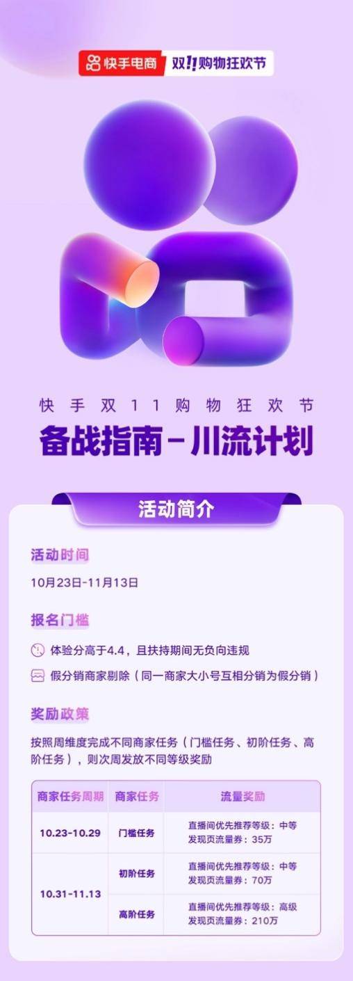 作为快手电商打通自播与分销的重要政策,今年双11快手电商川流计划推出了新的政策玩法。10月23日-11月13日,快手电商「川流计划」根据商家完成“分销”任务的程度,为其发放不同等级的流量、直播曝光等奖励,为商家在大促期间甚至此后更长线的成长提供更多确定性。
