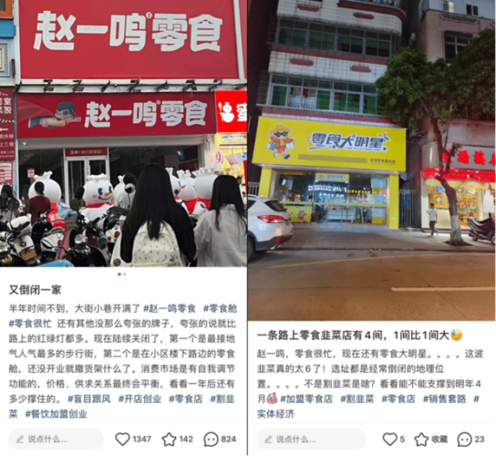 一个案例是,一个才3万常住人口的小县城开了快10个零食集合店,市场严重过剩。盲目扩张及价格战也导致许多品牌无法持续,连赵一鸣这样的头部品牌在某些竞争过剩严重的区域都支撑不住了,更不用说尾部品牌了。