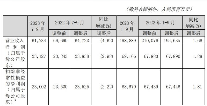 交通银行三季报显示,今年前三季,该行营业收入为1988.89亿元,同比增1.66%;归属于母公司股东净利润为691.66亿元,同比增1.88%。第三季度,该行营业收入为617.34亿元,同比降4.62%;归属于母公司股东净利润为231.27亿元,同比降2.98%。