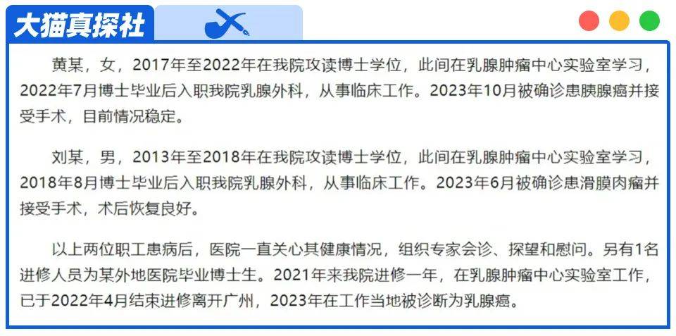 但是,在随后的11月8日,中山二院又发了一则情况说明,承认有相关人士患癌,但是否认有在读学生,根据情况说明,三名人员分别罹患胰腺癌、滑膜肉瘤和乳腺癌,有2名是二院乳腺外科的在职医生,另外一名为外地进修人员,已回原单位。