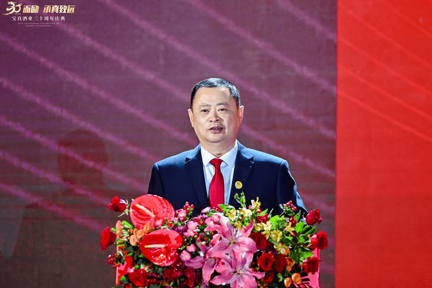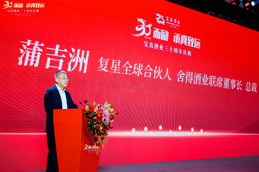 复星全球合伙人、舍得酒业联席董事长、总裁蒲吉洲向宝真酒业三十周年庆典致贺词。