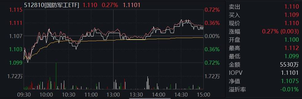 场内ETF方面,国防军工ETF(512810)低开震荡走高,尾盘场内价格逆市收涨0.27%,全天成交额5530万元。
