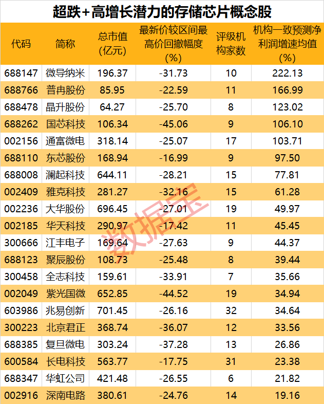 机构普遍看好部分存储芯片概念股的未来增长潜力。数据宝统计,根据5家以上机构一致预测,今明后三年净利润增速均有望超20%的概念股有20只。