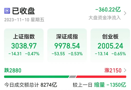 今日,A股三大指数集体收跌,沪指跌0.47%,深证成指跌0.53%,创业板指跌0.65%。市场成交额萎缩至8200多亿元。行业板块涨少跌多,燃气、医药商业、煤炭业、石油等板块涨幅居前,保险、文化传媒、游戏、汽车整车、互联网服务等板块跌幅居前。