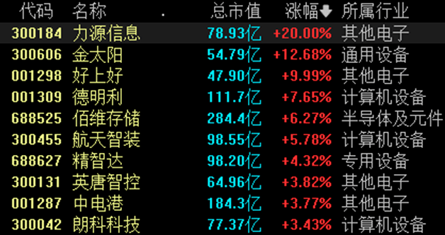 板块中,还有好上好涨停,金太阳大涨超12%,德明利、佰维存储、航天智装、精智达等跟涨。