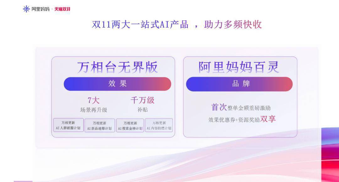 例如在前端的创意内容生成上,提供更多0门槛可上手的工具,在后端的投放环节,阿里妈妈推出的两大一站式AI产品万相台无界版和阿里妈妈百灵,实则是打通了渠道和营销壁垒,利用AI能力,更好地匹配资源,实现更精准地投放与转化,而不是过去依靠人工操作,靠天吃饭。据淘天官方数据,在天猫双11期间,相关AI工具已产生超15亿次调用。
