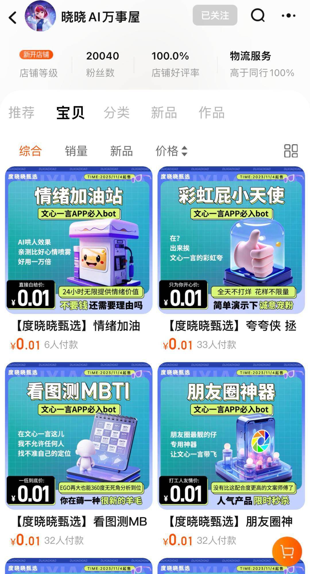 此前,百度AI数字人度晓晓与真人拍卖师尹晨阳推出全网首次数字人拍卖,度晓晓还在淘宝开设了“晓晓万事屋”淘宝店,从店内的商品来看,多是基于文心一言APP的相关服务,从朋友圈神器、情绪加油战再到彩虹屁小天使,定价均为0.01元。不难看出,此举旨在以趣味性内容触达更多用户,本质上是为了文心一言引流。