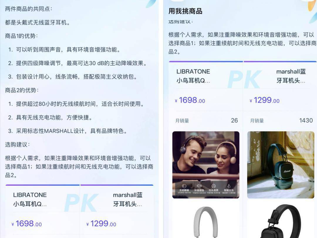 硅基研究室选择两款无线蓝牙耳机, 使用“淘宝问问”可给出具体的购买建议