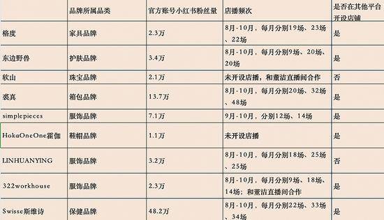 界面新闻统计了榜单中部分品牌的在小红书的运营情况。总结来看,他们大部分都在小红书开启了店播,且频率较高,或是和董洁、章小蕙这样的小红书头部“买手”进行过合作。