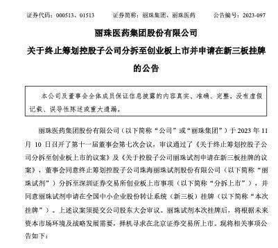 11月10日,丽珠医药集团股份有限公司(以下简称“丽珠集团”或“公司”)发布关于终止筹划控股子公司珠海丽珠试剂股份有限公司(以下简称“丽珠试剂”)分拆至创业板上市并申请在新三板挂牌的公告。